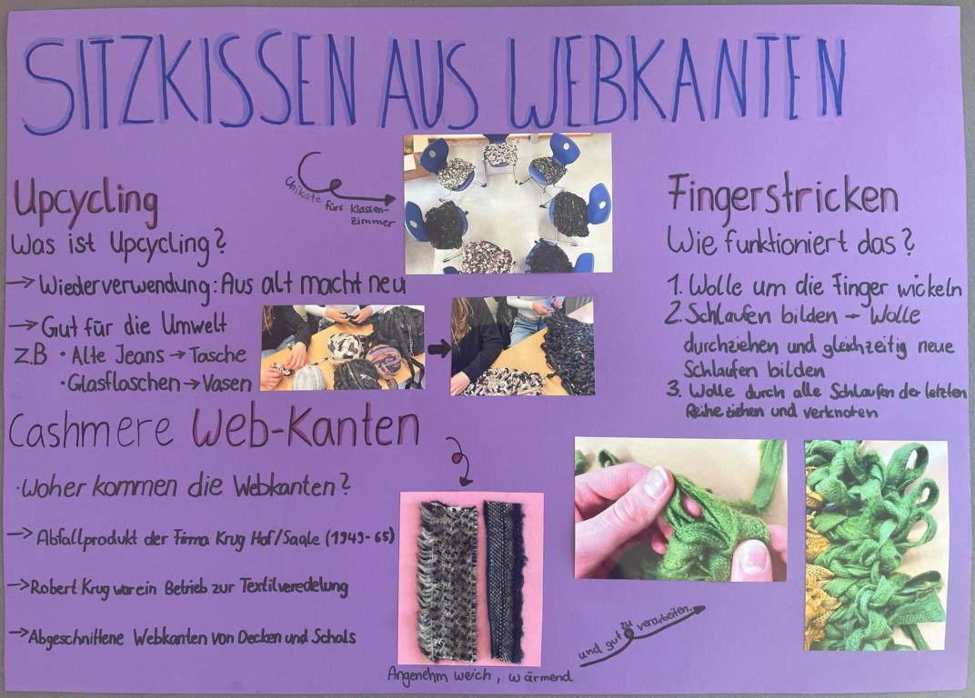 Die Klasse 7a beschäftigte sich mit dem Thema „Upcycling greifbar machen und sinnvolle Endprodukte für den Einsatz in der Schule schaffen“. Die Schülerinnen und Schüler erlernten unter anderem die Methode des Fingerstrickens und gestalteten in Einzelarbeit Sitzkissen für ihre Stühle im Klassenzimmer.
